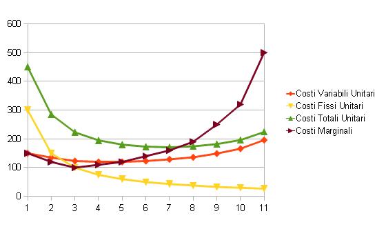| Quantità | Costi Fissi Unitari | Costi Variabili Unitari | Costi Totali Unitari | Costi Marginali |