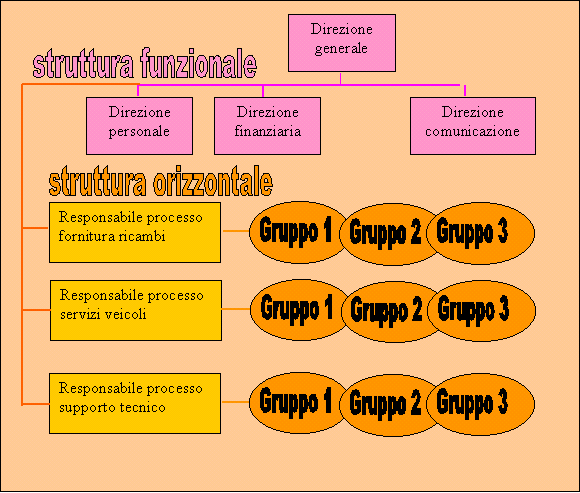 Nell'organigramma di sopra vediamo una struttura ibrida di una azienda automobilistica che ha deciso la soddisfazione del cliente. Diversi gruppi sono posti orizzontalmente e si concentrano sui processi chiave come la fornitura di ricambi, la logistica, intesa come reperimento di ricambi e spedizione ai rivenditori in modo rapido ed efficiente, sui servizi e manutenzione dei veicoli, con raccolta e diffusione delle informazioni relative a problemi di riparazione, e sul supporto tecnico, in modo che ogni unità di servizio riceva informazioni tecniche aggiornate. Ogni gruppo ha un responsabile di processo.