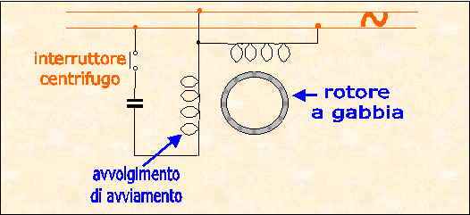 Vi sono due avvolgimenti; un primo avvolgimento principale è quello che funziona a regime e non è in grado di generare un campo magnetico rotante tale da far partire il motore; di conseguenza occorre un secondo avvolgimento detto di avviamento che ha lo scopo di far partire il motore sotto carico. L'avvolgimento di avviamento ha in serie un condensatore, il quale ha la funzione di sfasare di 90° la corrente dell'avvolgimento di avviamento, rispetto a quella dell'avvolgimento principale. In tal modo si genera un campo magnetico rotante in grado di far partire il motore. Una volta partito l'avvolgimento di avviamento può essere staccato mediante un interruttore che si stacca non appena sia raggiunta la velocità di regime, a causa della forza centrifuga.