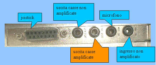 Vi è la presa per il joistick, cioè l'apparecchiatura che si usa nei giuochi; vi è una presa per le casse che non hanno bisogno di un amplificatore; vi è una presa per le casse che hanno un amplificatore interno; sono queste le casse che noi abbiamo; quindi in questa presa, che è la terza da sinistra, dobbiamo inserire lo spinotto delle nostre casse.
