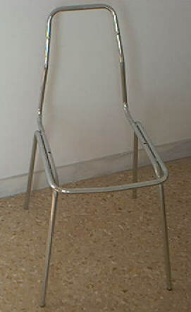 Montiamo dapprima lo schienale della sedia e poi il sedile. La nostra sedia è costituita da un robusto telaio in acciaio inossidabile, che è un particolare ferro che dura molto nel tempo. Sul telaio sono praticati due fori per fissare il sedile e due fori per fissare lo schienale. Sia il sedile che lo schienale sono in legno, rivestito con spugna e stoffa. Nel legno dello schienale sono state infilate due viti con dado interno. Nei due dadi interni vanno avvitati i due bulloni, dopo averli fatti passare nei due fori del telaio in acciaio.