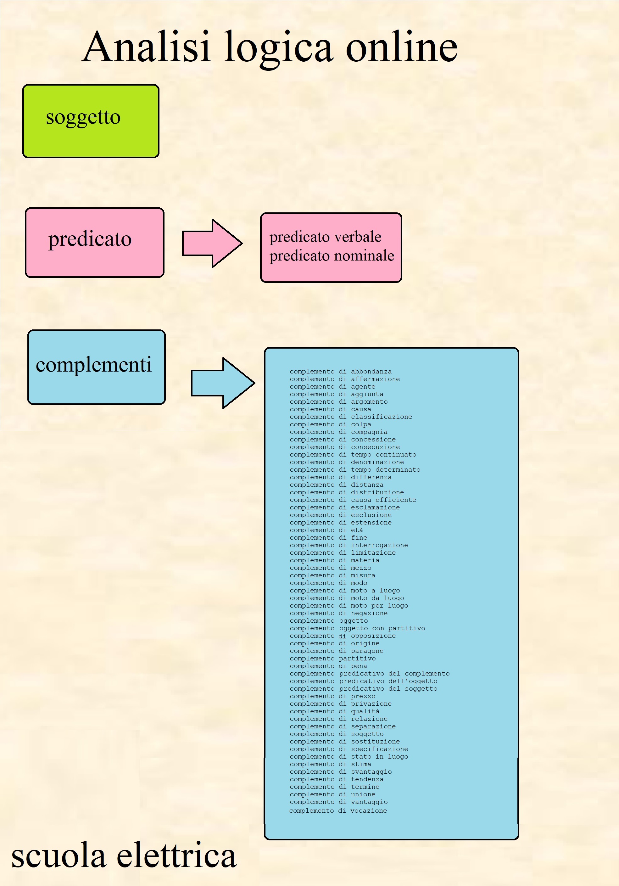 L'analisi logica di una frase italiana non è una cosa semplice. Per poterla fare correttamente occorre prima conoscere l'analisi grammaticale, cioè data una singola parola, riconoscere se è un verbo, se è un nome, se è un aggettivo, ecc. ecc.