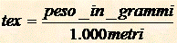 per ottenere il tex si prende come riferimento un chilometro di filo, cioè 1.000 metri; si pesano sulla bilancia questi mille metri e si fa il rapporto tra peso in grammi e lunghezza in metri e si ottiene il tex.