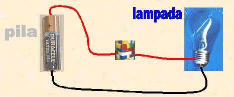 Nella figura di sopra abbiamo usato solo materiali di rame conduttore per collegare la lampadina alla pila; quindi la lampadina si accende perché la corrente passa nei fili di rame, partendo dal polo positivo della pila e ritornando al polo negativo della pila.
