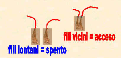 Se i due fili di rame, rivestiti in plastica rossa, sono separati, cioè stanno lontani, la corrente non può passare e la lampadina resta spenta.