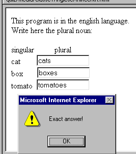 function controlfirst() { a=document.all.first.value; if (a=="cats") alert ("Exact answer!"); } function controlsecond() { a=document.all.second.value; if (a=="boxes") alert ("Exact answer!"); } function controlthird() { a=document.all.third.value; if (a=="tomatoes") alert ("Exact answer!"); } </script> This program is in the english language.<br>Write here the plural noun:<br><br> singular plural <br> cat <input type="text" name="first" onkeyup="controlfirst()" size="13"> <br> box <input type="text" name="second" onkeyup="controlsecond()" size="13"><br> tomato <input type="text" name="third" onkeyup="controlthird()" size="13"><br> |