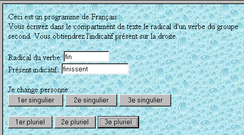 function conjugue(terminaison) { a=document.all.radical.value; document.all.conjugaison.value=a+terminaison; } </script> <body background="sfondo2.jpg"> Ceci est un programme de Français.<br> Vous écrivez dans le compartiment de texte le radical d'un verbe du groupe second. Vous obtiendrez l'indicatif présent sur la droite.<br> <br>Radical du verbe: <input type="text" name="radical" size="11"><br> Présent indicatif:: <input type="text" name="conjugaison" size="17"> <br><br> Je change personne: <br><input type="button" value="1er singulier" onclick="conjugue('is')"> <input type="button" value="2e singulier" onclick="conjugue('is')" > <input type="button" value="3e singulier" onclick="conjugue('it')" ><br><br> <input type="button" value="1er pluriel" onclick="conjugue('issons')" > <input type="button" value="2e pluriel" onclick="conjugue('issez')" > <input type="button" value="3e pluriel" onclick="conjugue('issent')" ><br> </body> |