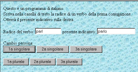 function coniuga(desinenza) { a=document.all.radice.value; document.all.coniugazione.value=a+desinenza; } </script> <body background ="sfondo2.jpg"> Questo è un programma di italiano.<br> Scriva nella casella di testo la radice di un verbo della prima coniugazione. <br> Otterrà il presente indicativo sulla destra.<br><br> Radice del verbo: <input type="text" name="radice" size="11"> presente indicativo: <input type="text" name="coniugazione" size="17"> <br><br> Cambio persona <br><input type="button" value="1a singolare" onclick="coniuga('o')"> <input type="button" value="2a singolare" onclick="coniuga('i')" > <input type="button" value="3a singolare" onclick="coniuga('a')" ><br><br> <input type="button" value="1a plurale" onclick="coniuga('iamo')" > <input type="button" value="2a plurale" onclick="coniuga('ate')" > <input type="button" value="3a plurale" onclick="coniuga('ano')" ><br> </body> |