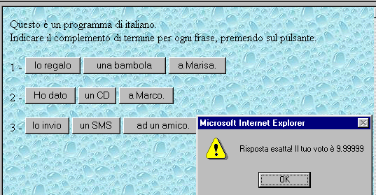 contatore=0; function verificaprima(tipo) { if (tipo=="a Marisa.") { contatore=contatore+3.33333; alert ("Risposta esatta! Il tuo voto è "+contatore); }; } function verificaseconda(tipo) { if (tipo=="a Marco.") { contatore=contatore+3.33333; alert ("Risposta esatta! Il tuo voto è "+contatore); }; } function verificaterza(tipo) { if (tipo=="ad un amico.") { contatore=contatore+3.33333; alert ("Risposta esatta! Il tuo voto è "+contatore); }; } </script> <body background="sfondo2.jpg"> Questo è un programma di italiano.<br> Indicare il complemento di termine per ogni frase, premendo sul pulsante.<br><br> 1 - <input type="button" value="Io regalo" onclick="verificaprima('Io regalo')"> <input type="button" value="una bambola" onclick="verificaprima('una bambola')" > <input type="button" value="a Marisa." onclick="verificaprima('a Marisa.')" >