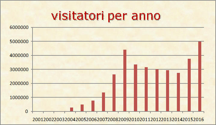 | visitatori | 276.898 | 500.086 | 776.818 | 1.368.042 | 2.655.840 | 4.398.998 | 3.353.302 | 3.163.669 | 3.013.492 | 2.956.687 | 2.758.988 | 3.757.212 | 4.979.503 | |||