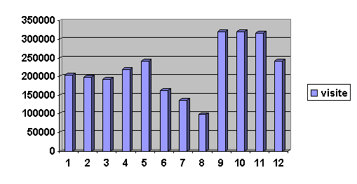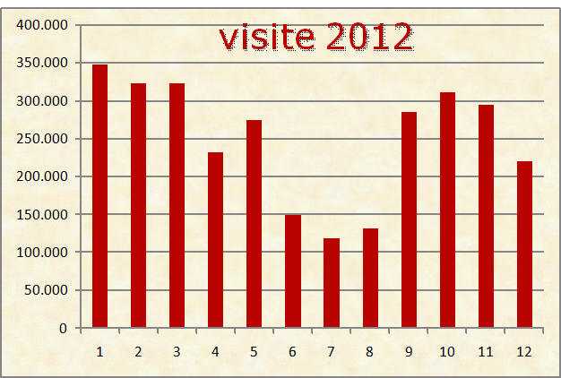 | visite | 341.095 | 280.704 | 287.015 | 249.921 | 276.266 | 184.698 | 148.743 | 162.262 | 338.343 | 316.387 | 328.526 | 249.709 | 3.163.669 |