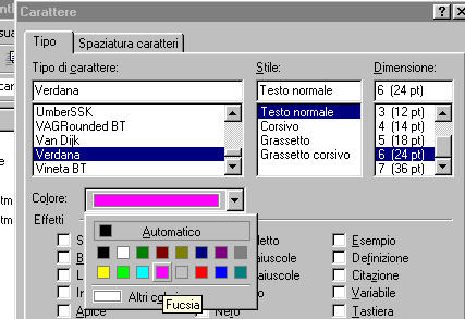 'Arial per i titoli, oppure il Times New Roman per il testo.Nel nostro caso, poiché vogliamo utilizzare il font "Verdana" selezioniamo il font Verdana facendo scorrere la finestrella e facendo click su Verdana, notiamo che anche sopra sia scritto "Verdana".