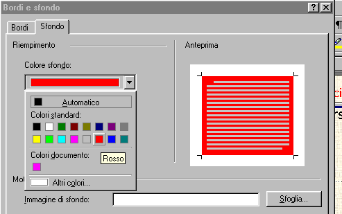 da cui scegliamo"Sfondo" e come colore di sfondo scegliamo il Rosso. Poi sempre Ok per uscire. A questo punto salviamo e facciamo un'anteprima per vedere il colore rosso.