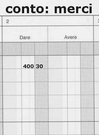 Se, oggi, abbiamo acquistato della merce per la somma di 400,30 Euro dobbiamo immaginare che il responsabile del conto merci, avendo avuto in consegna della merce per un valore pari a 400,30 Euro, ci deve dare 400,30 Euro di merci, quindi sulla colonna dare del conto merci annotiamo: