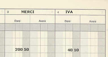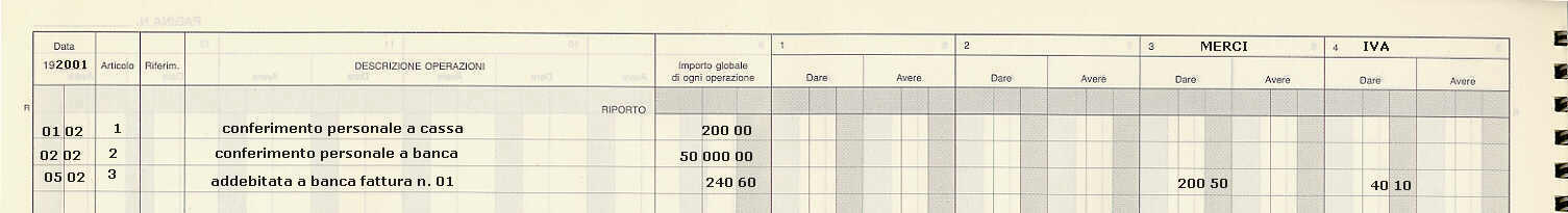 Il conto IVA è uno dei conti più usati, per cui gli diamo il conto n.4. Il conto IVA interessa tutti gli acquisti effettuati dall'impresa e tutti i corrispettivi ricevuti dall'impresa a seguito della prestazione effettuata. L'importo dell'IVA si ricava dalla fattura. Nel caso di ricevimento il giorno 05/02/2001 di una fattura di acquisto di merce, pagata con assegno bancario dell'impresa, dell'importo totale di € 240,60, di un valore imponibile di € 200,50 ed IVA € 40,10, l'annotazione sul giornale sarà: