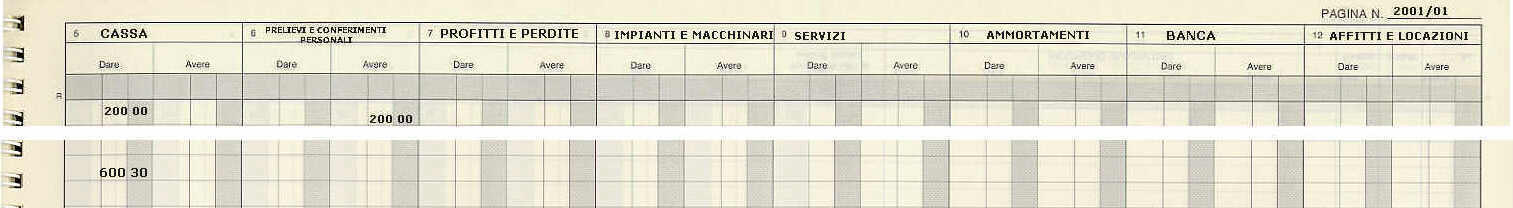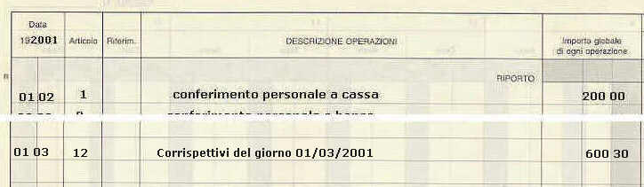 Supponiamo che in data 01/03/2001 l'incasso per la vendita di merci sia stato in totale di € 600,30; di cui per imponibile € 500,25 e per IVA 20 % (su imponibile di € 500,25) € 100,05.